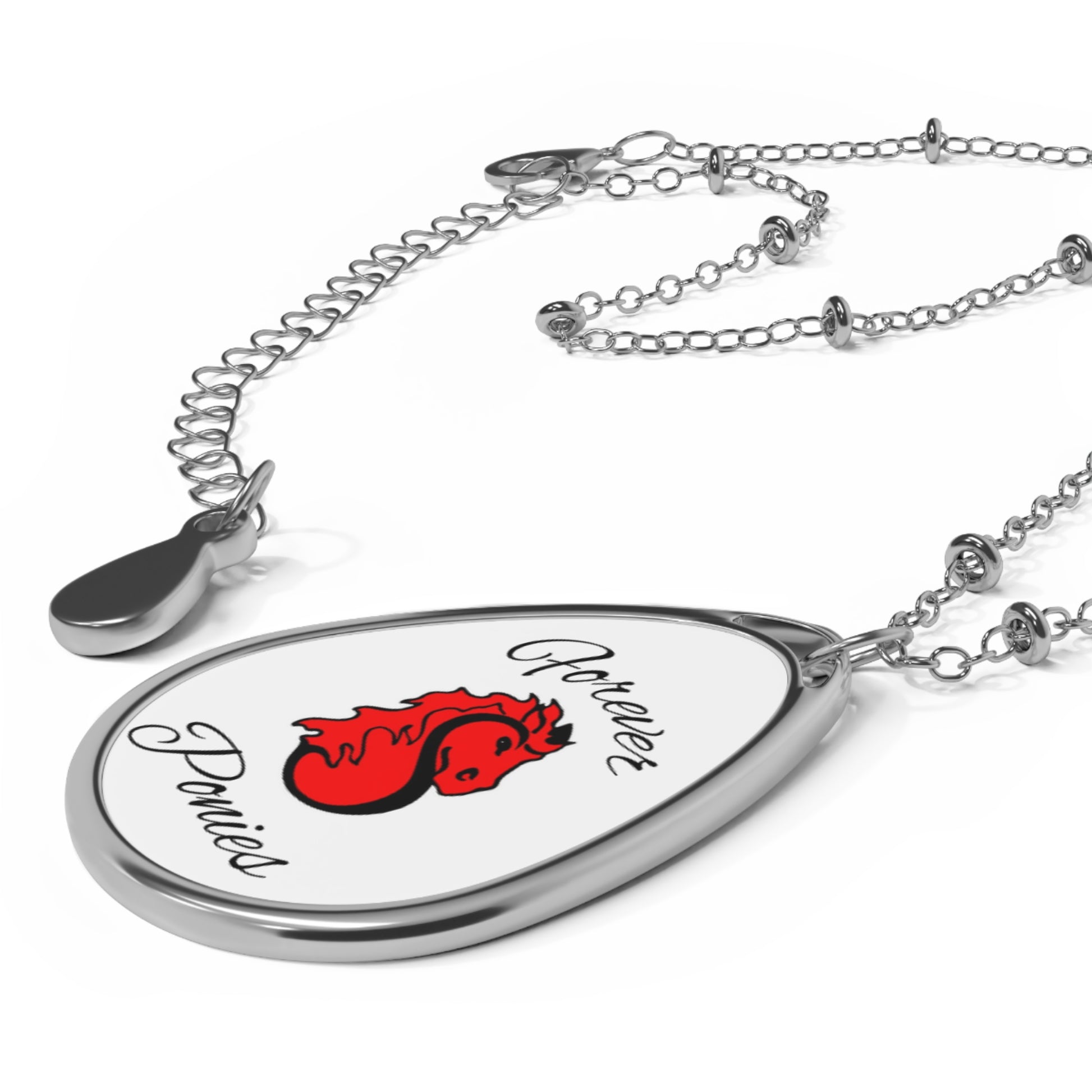 This oval (ellipse) necklace brings a pocket of joy and motion to everyday wear. Bright, glossy artwork sits on a white aluminum surface, so the colors of the Stillwater Ponies “Forever” design sing with clarity. The smooth ellipse pendant catches light and attention while a sturdy lobster clasp keeps it snug during long days — whether you’re wandering local trails, tending a studio, or gathering with friends at a small, cozy celebration. Lightweight zinc-alloy chain and pendant mean it layers easily with other pieces or stands alone as a quiet, expressive talisman that recalls sunlit pastures and the steady companionship of ponies.